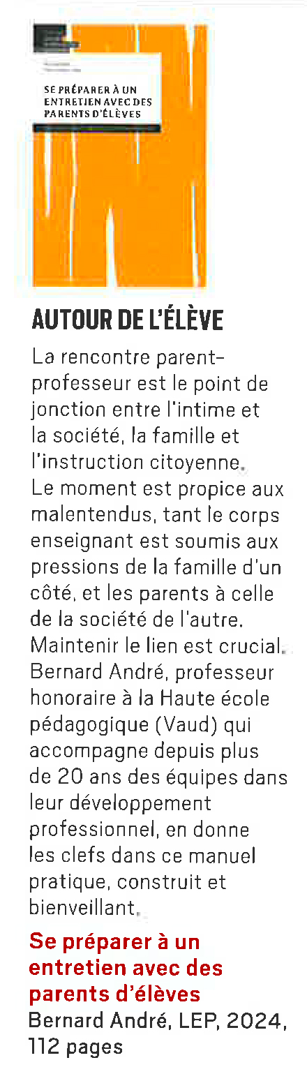 Que vous débutiez dans l’enseignement ou que vous ayez déjà une grande expérience, cet ouvrage sera votre allié pour instaurer une relation de confiance solide avec les parents d’élèves. Et si vous êtes parent, il vous aidera à vous préparer en prévision d’un entretien pour accompagner au mieux le parcours scolaire de votre enfant.